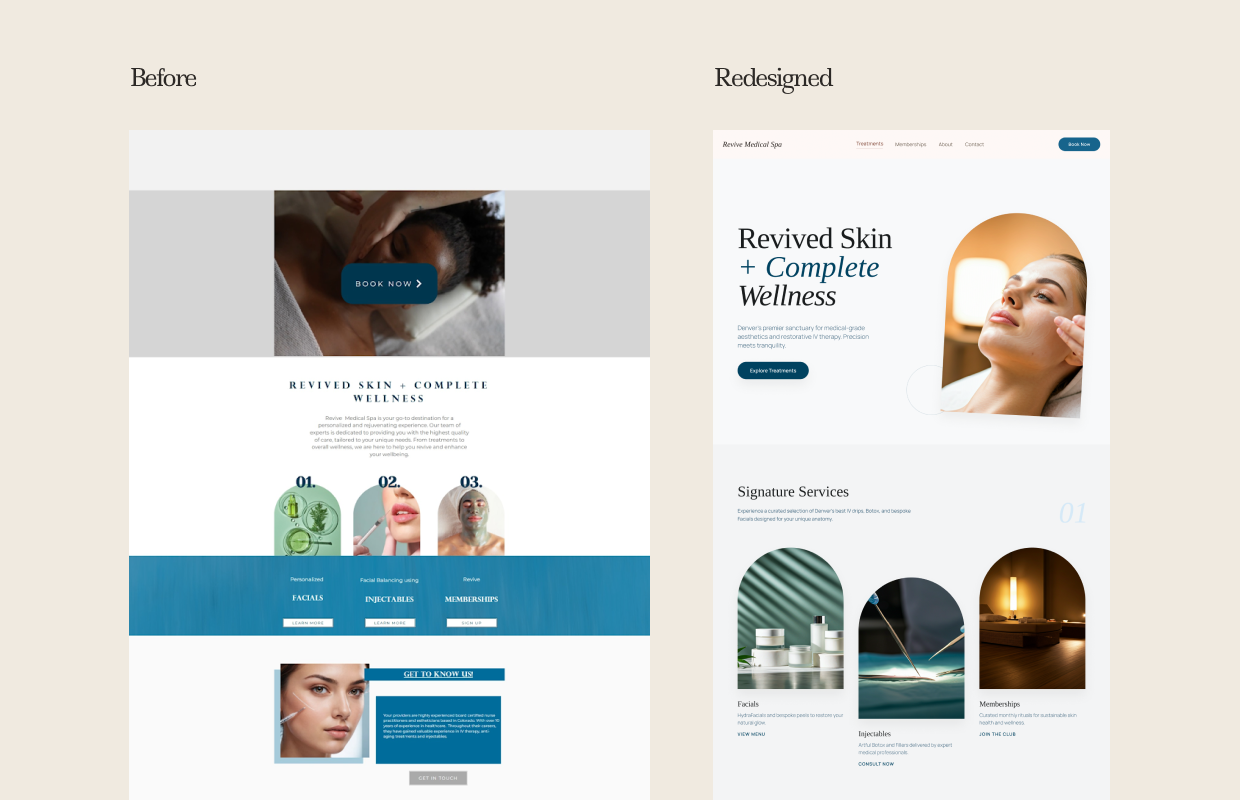 The existing site used a generic teal-and-white template shared by hundreds of med spas across the US. The hero was a stock photo of a woman receiving a facial with a large "BOOK NOW" button overlaid in the centre. The headline — "REVIVED SKIN + COMPLETE WELLNESS" — appeared below the fold in all caps, centred, with a small paragraph of generic copy underneath.