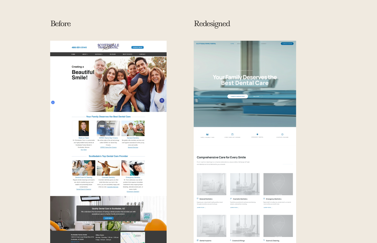Scottsdale Family Dental had a homepage that looked nearly identical to hundreds of other practices across Arizona. The hero was a stock photo of a multi-generational family with a generic headline — "Creating a Beautiful Smile!" — and no clear next step for a visitor to take. The phone number sat in the header, the booking button was buried in the navigation, and the services section below the fold used small images and paragraph-length descriptions that nobody reads on mobile.